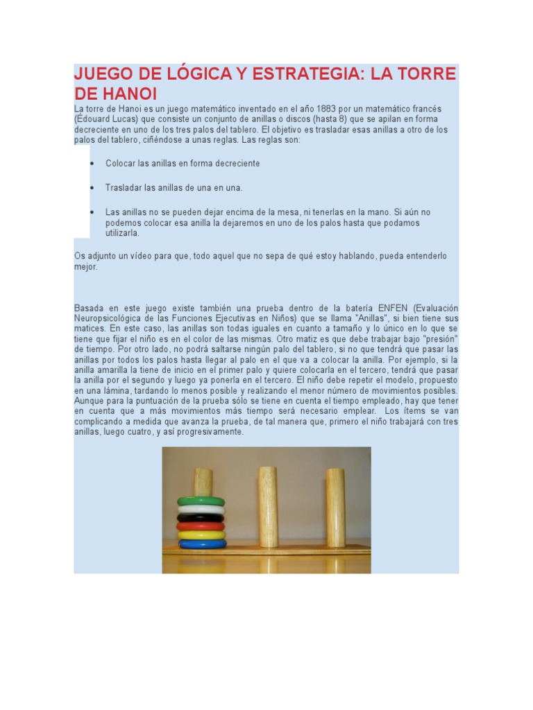 1 from La matemática y son utilizadas en la psicología. Actividad de juegos y matemáticas existente en su escuela. El objetivo del juego es crear la pila en otra de las estacas siguiendo unas ciertas reglas. Se trata de un juego de ocho discos de radio creciente que se apilan insertándose en una de las tres estacas de un tablero. Juegos archivos pagina 5 de 9 neuronilla. El juego fue inventado por edouard lucas , un matemático que estudió la secuencia de fibonacci. El problema es muy conocido en la ciencia de la computación y aparece en muchos libros de texto. Historia y reglas del juego jenga.